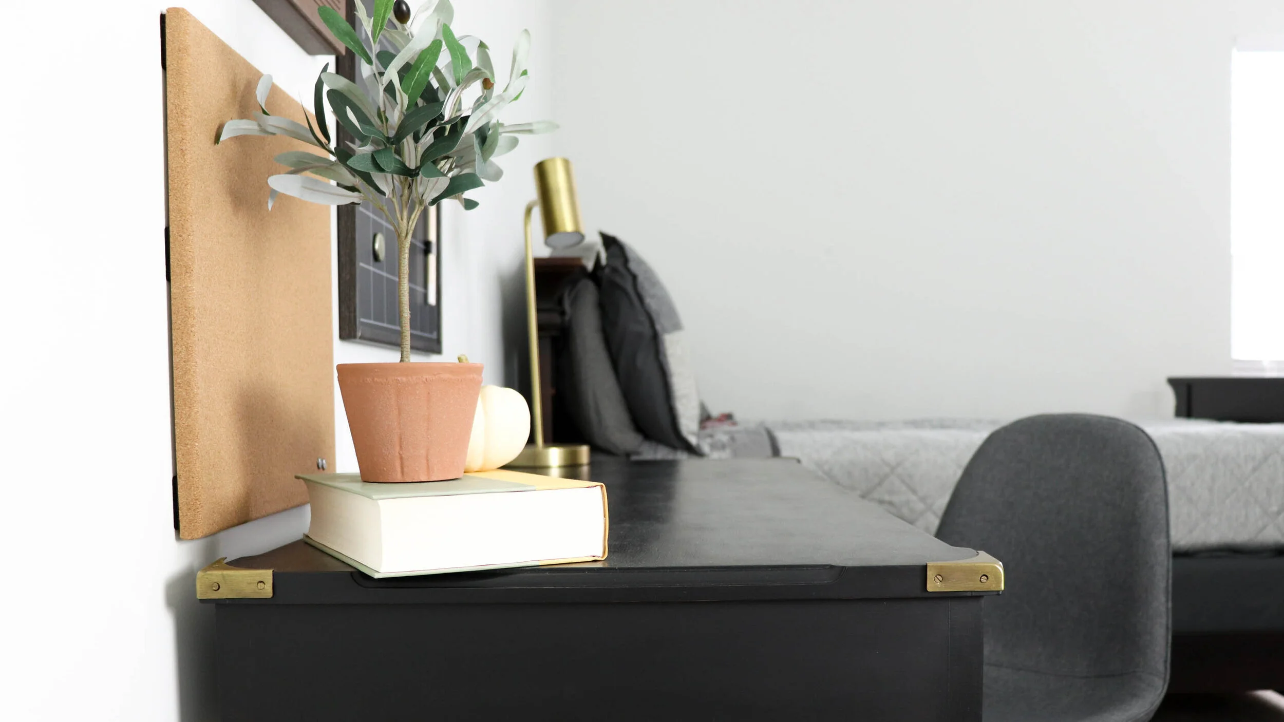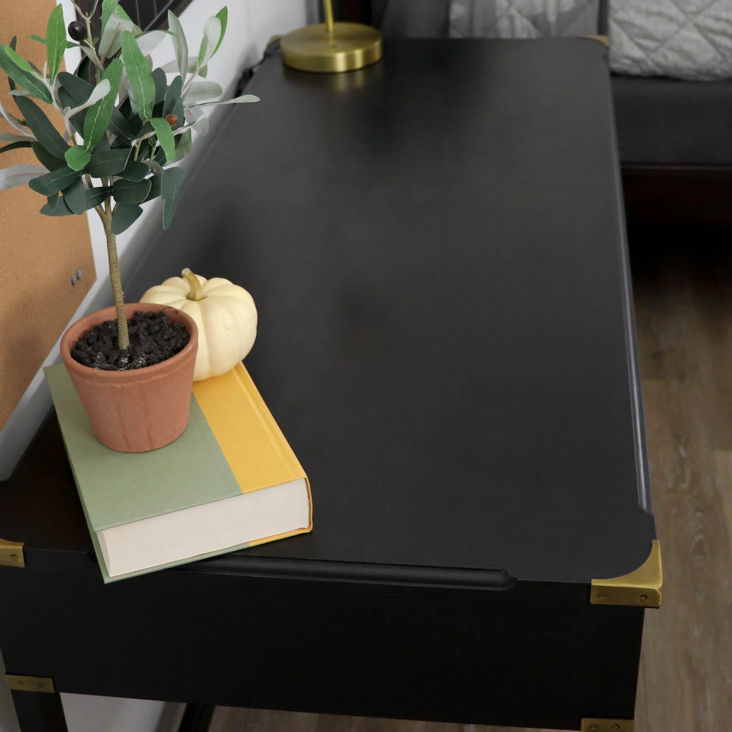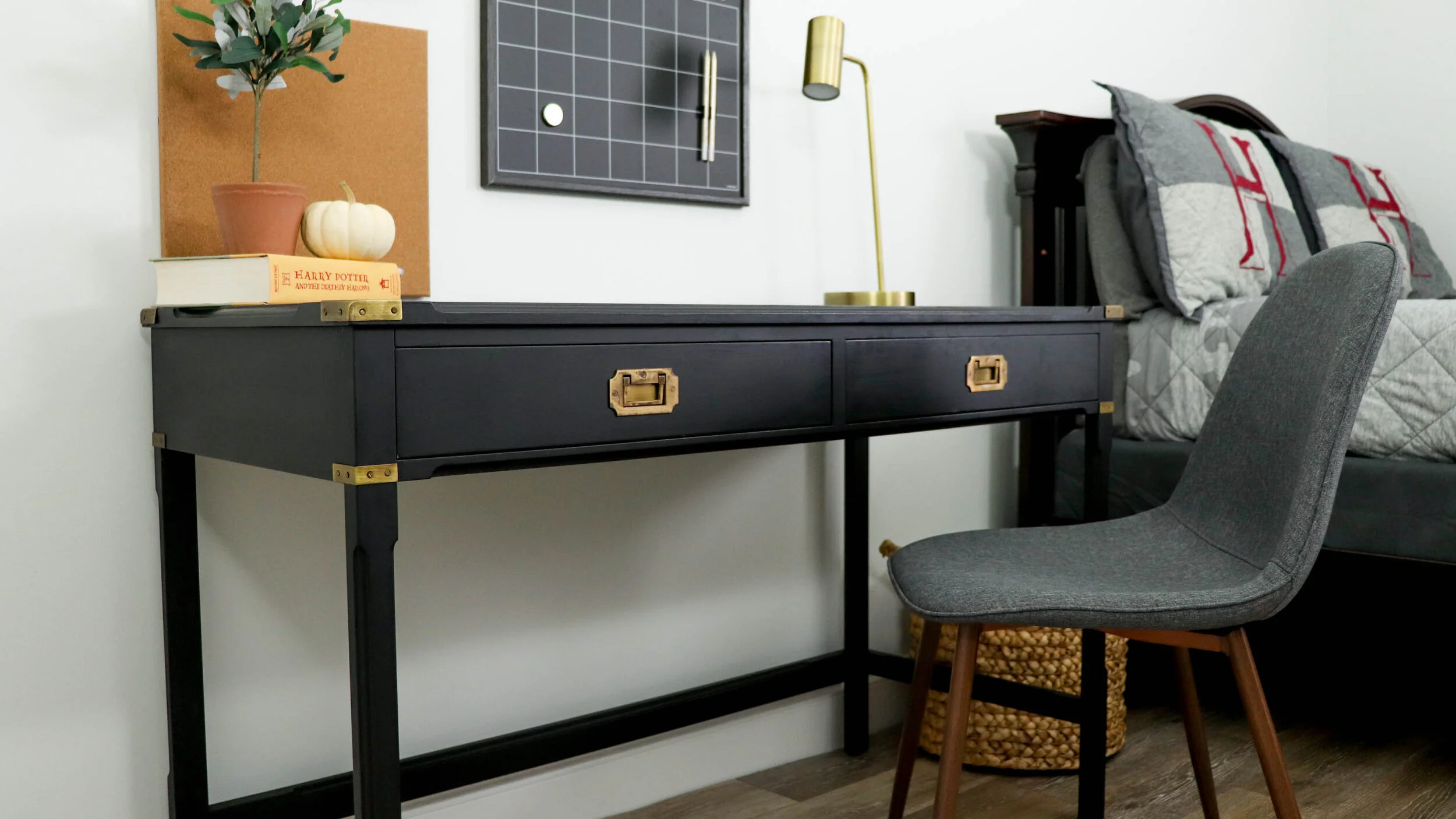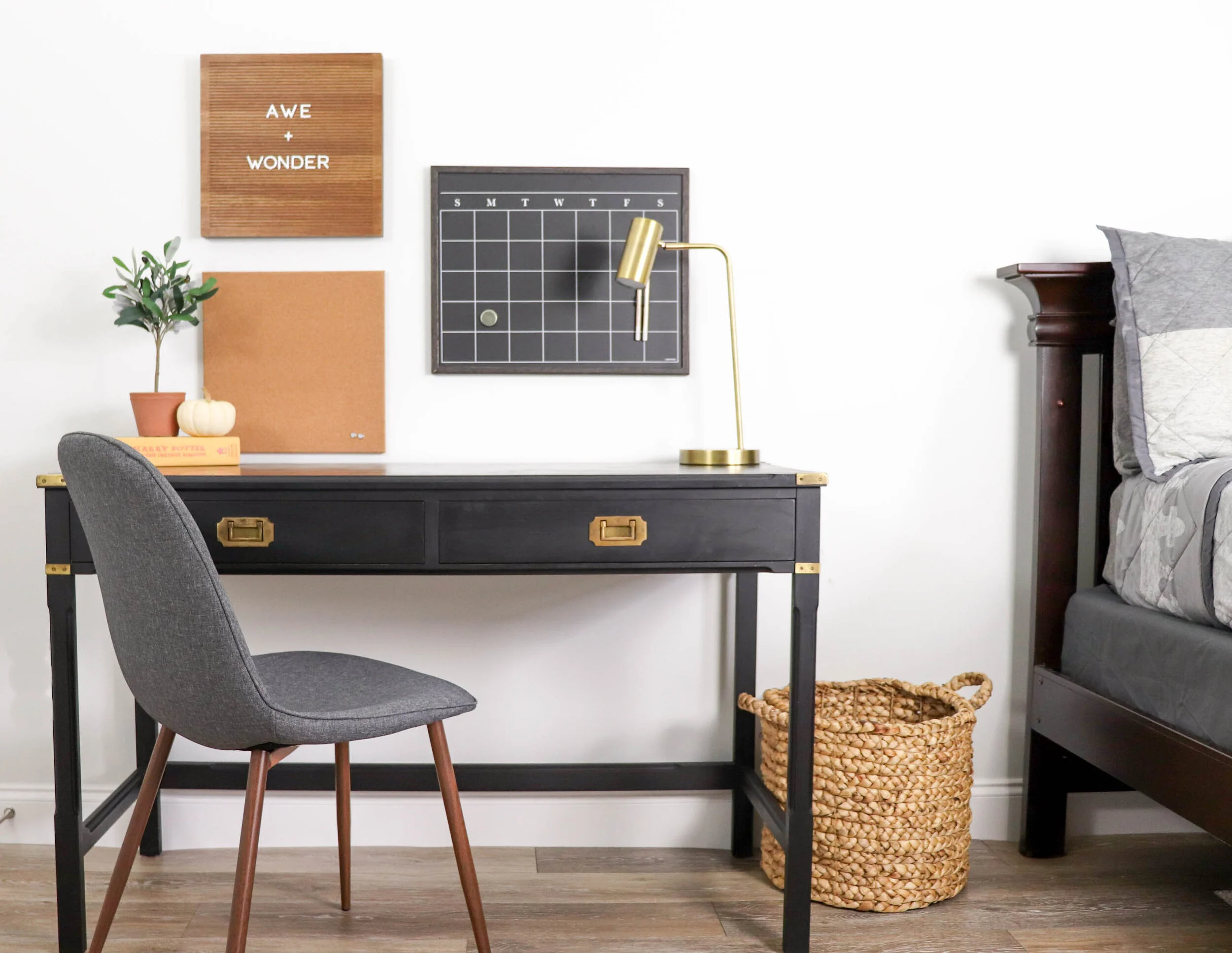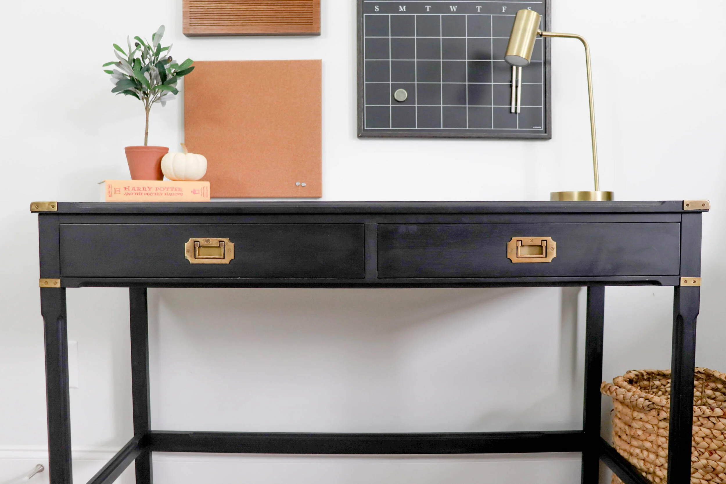 This desk is for my son’s room, and I had a lot of fun shopping for items to style is at Target. Everything you see in the photo can be found in one place. How awesome is that? I kept that brass hardware because I loved the way it popped with the black noir color of the desk. And it really inspired the items I chose to style.