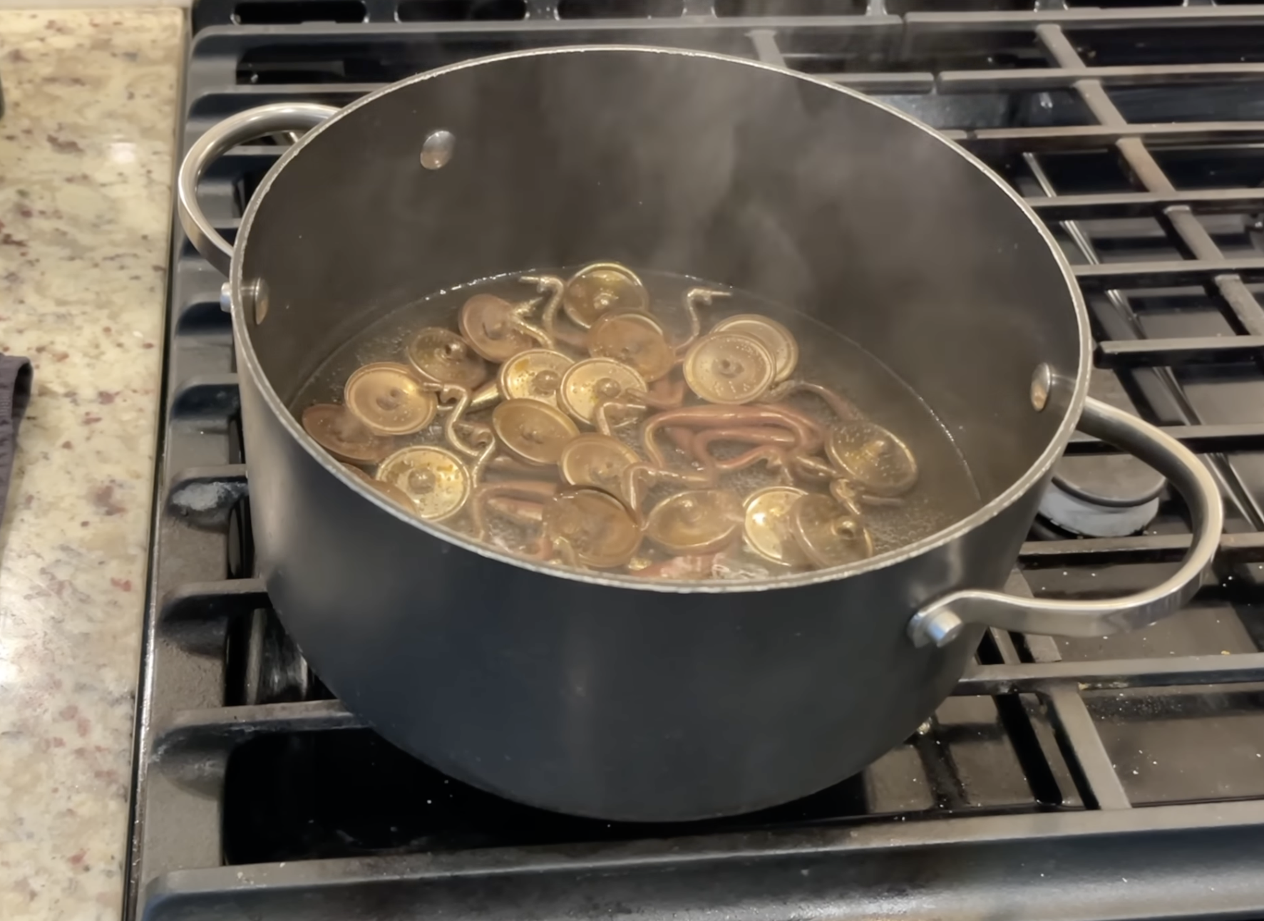 To clean old hardware, all you have to do is boil the hardware on a low simmer with equal parts water and vinegar in a well ventilated space. Then, once the hardware is cooled off and dry, you take some fine steel wool and polish it. It’s always shocking how good this works! The hardware looks brand new.